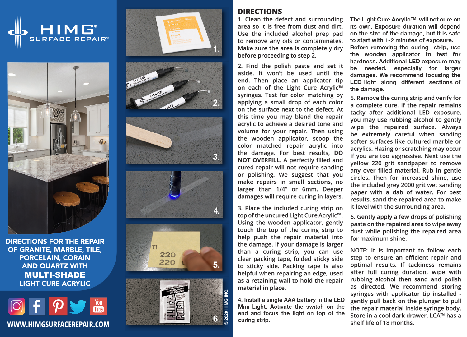 Our DIY HIMG® Surface Repair kits utilize high-tech LCA™ (Light Cure Acrylic) technology, to cure with a specific spectrum of blue light. Once cured, it can withstand moisture, cleansers and heat up to a maximum of 285ºF. It is non-toxic and a safe alternative to epoxy. Our DIY kits have all the components to make quality repairs in a matter of minutes. The  SCA™ (Self Cure Acrylic) works by combining two separate components that form one strong bond when mixed together. The material is self cure and requires no LED light for hardening.