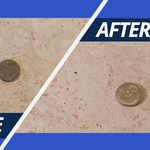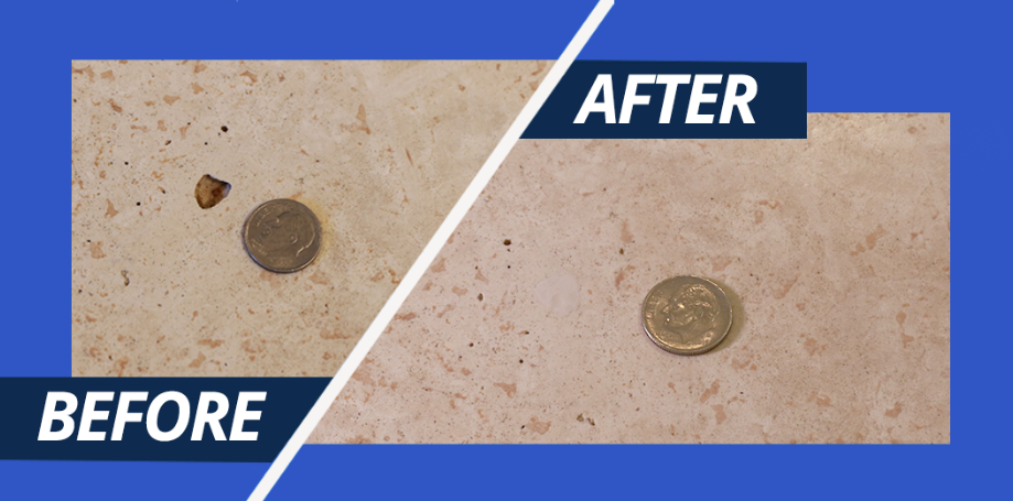 Before and after image of a brown colored granite, chip repair. Don’t replace, repair with HIMG Light Cure Acrylic Surface Repair Kits.